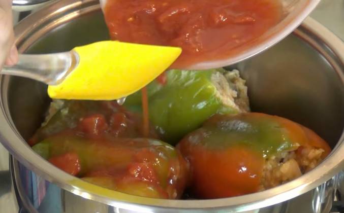 3. Мы будем фаршировать перец. Берём перец. Ложку поменьше. Наполняем. Наполненные перцы перекладываем в кастрюлю. Укладываем плотно. Теперь приготовим соус. Добавляем соль в томатный сок с кусочками помидоров. Чуть-чуть растительного масла. Перемешиваем. Можно добавить немножко водички. Чуть-чуть. Разбавляем. Заливаем перец. Готовить буду под крышкой по термоконтроллеру. Перец надо довести до кипения. Начинка уже готова, перец подмороженный, поэтому всё приготовится очень быстро. Накрываем крышкой. Ждём, когда стрелка дойдёт по первого деления зелёного поля. В обычной кастрюле доводим под крышкой до кипения. Перец закипел. Отключаем нагрев. Оставляем под закрытой крышкой на 10 минут. Перец настоялся. Можно подавать к столу. У нас получилось постное и вегетарианское блюдо.Видео рецепт ютуб ниже 👇