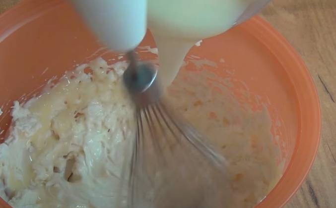 3. Проверяем готовность при помощи деревянной палочки. Палочка сухая. Пирог готов. Достаём его из духовки. Тесто полностью пропеклось, стало золотистым по краям. Оставляем в форме остывать. Сейчас будем делать крем. Перекладываем сливки в миску. Взбиваем венчиком. Постепенно добавляем сгущённое молоко и продолжаем взбивать. Крем готов. Теперь надо перемолоть мелко орехи. Разрезаем пирог на две части. Одну часть смазываем кремом. Крем не жалеем. Сверху посыпаем молотыми орехами.