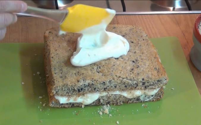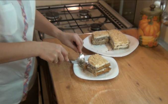 4. Накрываем сверху второй половинкой. Слегка придавливаем. Смазываем сверху кремом и посыпаем орехами. Убираем десерт пропитываться на 5-6 часов в холодильник. Торт пропитался кремом. Крем немного застыл. Из этого торта сделаем 4 пирожных. Разрезаем крест на крест. На срезе пирожное получилось очень симпатичным. Благодаря тому, что в тесте молотый изюм. Попробуем! Вкусно! Пирожное получилось мягким, вкусным, чувствуются сливки. Чувствуются орешки, а изюм практически не чувствуется. Достаточно вкусно! Этот замечательный десерт - пирожное "Белочка" станет замечательным дополнением к вашему чаепитию.Видео рецепт ютуб ниже 👇
