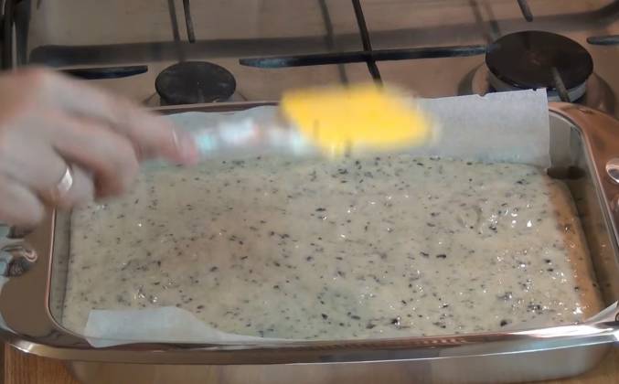 2. Буду молоко добавлять по частям. Теперь сюда надо добавить просеянные через сито муку и разрыхлитель. Постепенно замешиваем тесто. К основному тесто аккуратно подмешиваем белки. Желательно это делать при помощи лопатки. Тесто готово. Берём форму для выпечки. У меня прямоугольная 17х29 см. Застилаем пергаментной бумагой, смазанной сливочным маслом. Выливаем сюда тесто. Выравниваем поверхность. Делаем, чтобы тесто всё было на одном уровне. Ставим выпекаться в разогретую до 180 С духовку. Прошло 35 минут.