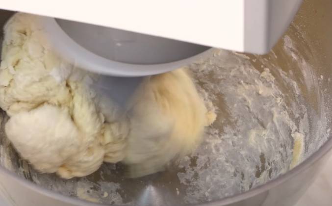 2. Устанавливаем насадку "крюк" и сначала на малых оборотах, а затем на средних замешиваем однородное, гладкое тесто без комочков, которое легко отстает от рук и стенок посуды. Конечно, вместо воды это тесто можно замесить на молоке, смеси молока и воды, а еще лучше на картофельном отваре. Вместо растительного масла можно использовать сливочное, маргарин или жир, растопленный до густоты сметаны. В результате должно получиться эластичное, очень мягкое и приятное на ощупь тесто. Слегка смазываем стол маслом, еще немного подмешиваем тесто, округляем его и укладываем в смазанную маслом миску для дальнейшего подъема.