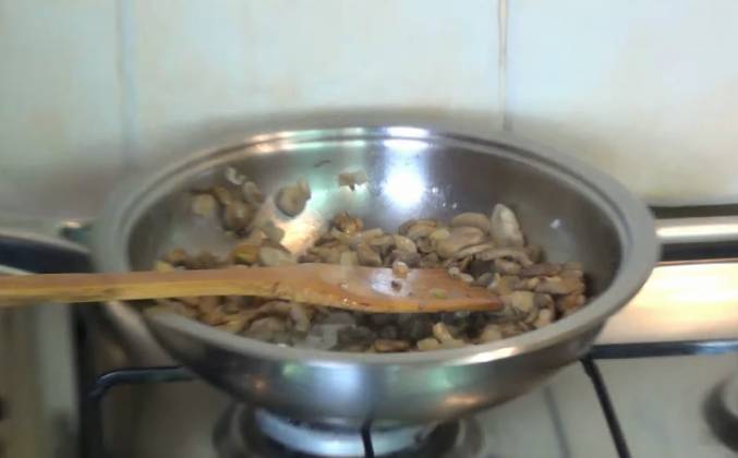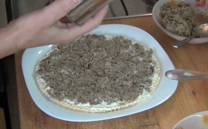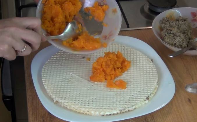 2. Отключаем нагрев и оставляем их остывать. Приготовим начинки для торта. Продукты надо измельчить до пастообразного состояния. Это можно сделать при помощи блендера или мясорубки. Я буду использовать блендер. В одну миску складываем морковь. Сельдь с луком - в другую мисочку. Грибы с луком - в третью. Берём морковь. Нарезаем на кусочки. Морковь можно натереть на мелкой тёрке. Перемалываем. Таким же способом измельчаем грибы с луком. Селёдку измельчаем вместе с луком. Режем на кусочки. Начинаем собирать торт. Берём вафельный корж. Выкладываем его на тарелку. Сверху смазываем его майонезом. Берём сельдь с луком. Делим её на 2 части. Она пойдёт на 2 коржа. Берём снова корж. Сверху - майонез. Грибы с луком. Я их во время жарки не солила. Поэтому посолю сейчас. Снова корж. Майонез.