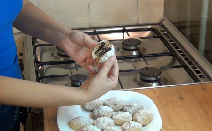 3. Прошло 15 минут. Открываем духовку. Печенье сверху немного зарумянилось. Можно отключать нагрев. Ориентируйтесь по своей духовке. Как только печенье подрумянится - отключайте нагрев. Оставляем печенье остывать в духовке. Готовое творожное печенье сверху посыпаем сахарной пудрой. Давайте посмотрим, что у нас получилось. Разламываем. Внутри - шоколад. Такое печенье хорошо подойдёт к кофе или к чаю.Видео рецепт ютуб ниже 👇