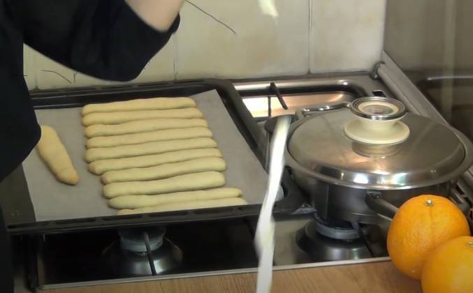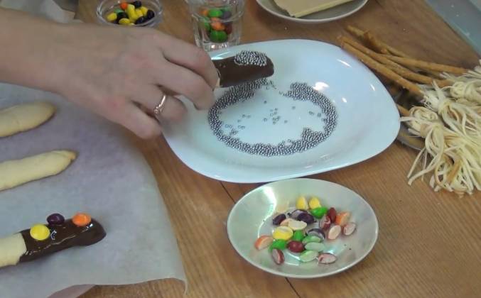 2. Прошло 20 минут. Палочки готовы. Отключаем нагрев. Достаём их из духовки и оставляем остывать. Сковорода парит. Отключаем нагрев. Оставляем под закрытой крышкой на 15-20 минут. Займёмся мётлами. Берём соломку. Сыр. Разделяем сыр на волокна. Держи. Чем тоньше, тем лучше. Получилась такая связка. Одну верёвочку оставляем. Складываем в 3 раза. Берём соломку. Оборачиваем её. Завязываем. Можно подровнять ножницами. Одна метла готова! Топим шоколад на водяной бане. Наливаем в миску воду. В другую миску ломаем шоколад. Отдельно топим чёрный и белый шоколад. Любая волшебная палочка должна быть красивой. Берём палочку. Окунаем её в шоколад. Лишнее убираем.