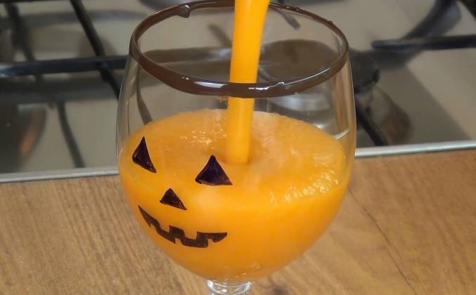 3. Выкладываем на пергаментную бумагу. Украшаем. Последнюю палочку окунули в белый шоколад. Сверху поливаем тёмным шоколадом. Украшаем. Убираем палочки застывать в холодное место. Выжимаем сок из апельсинов. Добавляем в сок остывшую тыкву. Хорошо взбиваем миксером. Теперь надо украсить фужер. Берём маркер, который хорошо рисует по стеклу. Оформляем. Готово! Окунаем в растопленный шоколад. Наливаем напиток. Пробуем магический нектар!Видео рецепт ютуб ниже 👇
