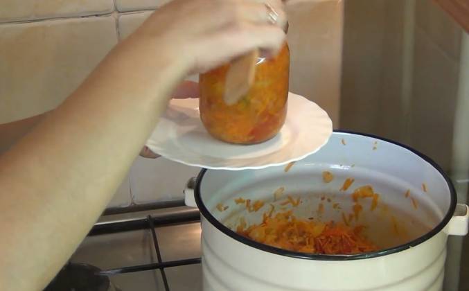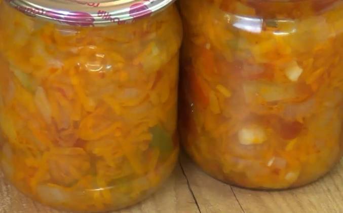 3. Отключаем нагрев. Берём стерилизованные баночку и крышку. Заполняем банку салатом. Накрываем крышкой. Закатываем. Все закатанные баночки переворачиваем на крышку. Укутываем тёплым полотенцем или одеялом. В таком положении оставляем их до полного остывания. Затем их раскрываем. Переворачиваем обратно. Салат "Четвёрочка" прекрасно хранится при комнатной температуре.Видео рецепт ютуб ниже 👇