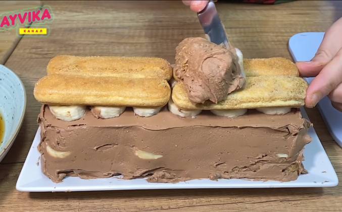 3. Окунаем савоярди в кофе и выкладываем слой по 2 палочки. Слой крема сверху и слой из банана в 1 ряд. Последний слой из савоярди - всего 2 палочки и слой крема сверху. Выравниваем края торта. Сверху посыпаем какао порошком. Ставим лайк и потом ставим торт в холодильник на 30 минут.Видео рецепт ютуб ниже 👇