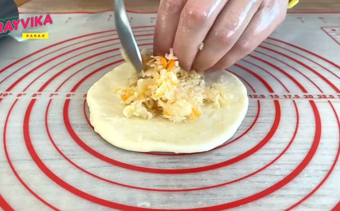 3. Формируем шарики, берем скалку, смазываем ее растительным маслом и раскатываем шарик. В раскатанную лепешку добавим 2 ст ложки фарша и защипываем края. Выровняем пирожок скалкой. Раскатываем еще один пирожок и наполняем теперь капустой и выравниваем форму. Лепим пирожки и выкладываем на досточку. Для жарки наливаем растительное масло и обжариваем пирожок с двух сторон. Выкладываем на бумажное полотенце и дегустируем.Видео рецепт ютуб ниже 👇