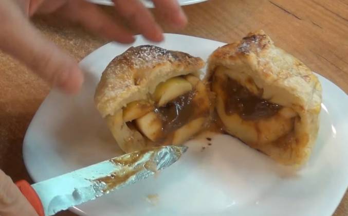 3. Берём фольгу. Ставим яблочко на фольгу и заворачиваем. Сильно придавливать не надо. Выставляем на противень. Ставим яблоки выпекаться в разогретую до 200-210 С духовку. Через 15-20 минут открываем духовку. Достаём противень с яблочками. Разворачиваем яблочки. Уменьшаем температуру до 180 С. Отправляем яблочки в духовку подрумяниваться. Яблоки готовы! Достаём их из духовки. Оставляем остывать. Готовые яблоки можно посыпать сахарной пудрой. Будем смотреть, что у нас получилось. Возьмём яблочко. Разрежем его пополам. Тесто слоёное, поэтому оно немножко крошится. Ничего страшного. Яблоко ещё тёплое внутри. Яблоки остывают долго. Вот наш десерт!Видео рецепт ютуб ниже 👇