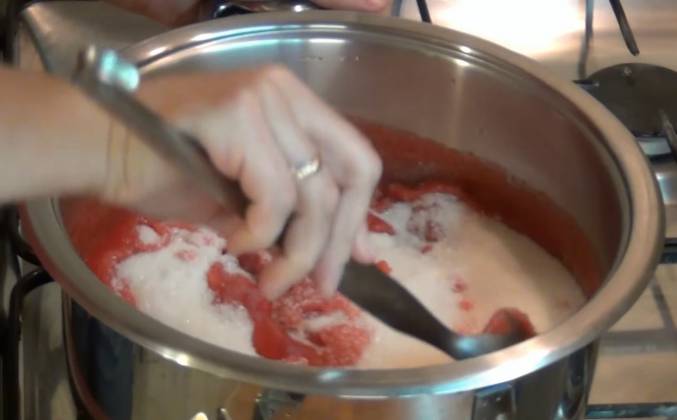 2. Для конфитюра нужны продукты в следующей пропорции: на 1 стакан сока 1 стакан сахара. Сначала наливаем сок. Нужно будет в сок добавить столько же стаканов сахара. У меня получилось 6 стаканов сока. Добавляем 6 стаканов сахара. Шесть. Включаем маленький огонь. У меня маленькая конфорка, поэтому включаю средний огонь. Берём большую ложку и перемешиваем. Доводим до кипения и варим на медленном огне. Аккуратно снимаем пенку через 15-20 минут после закипания. Конфитюр проварился 1 час. Больше варить не надо.