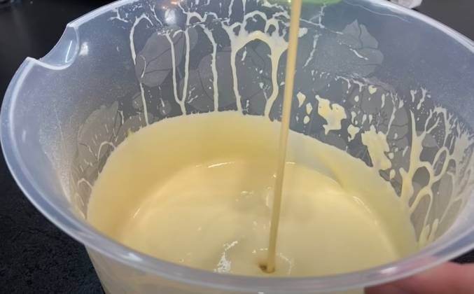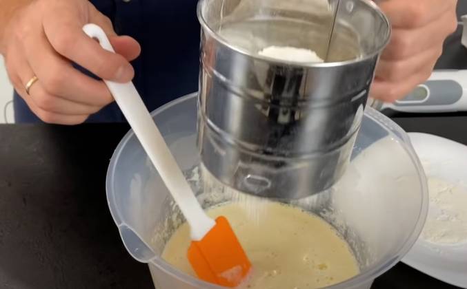 2. Взбитые желтки с белками соединяем, и аккуратно добавляем 3 столовых ложки муки, вмешиваем окупаться муку, добавляем 2 рюмки молоко, вмешиваем, после ещё 2 ложки столовый с горкой муки!