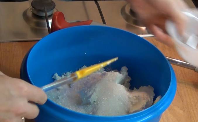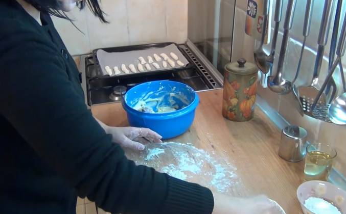 2. Перемешиваем. Получилось однородное тесто. Берём муку. Посыпаем мукой руки. Скатываем из теста вот такие колбаски. Выкладываем на пергаментную бумагу. Творожные палочки можно сделать и таким способом: Посыпаем стол мукой. Перекладываем часть теста на стол. Тесто липкое, поэтому надо обязательно посыпать стол мукой. Вот так вот раскатываем тесто в колбаску. Нарезаем на палочки. Ставим палочки в холодильник на 30-40 минут. Палочки будем обжаривать во фритюре.