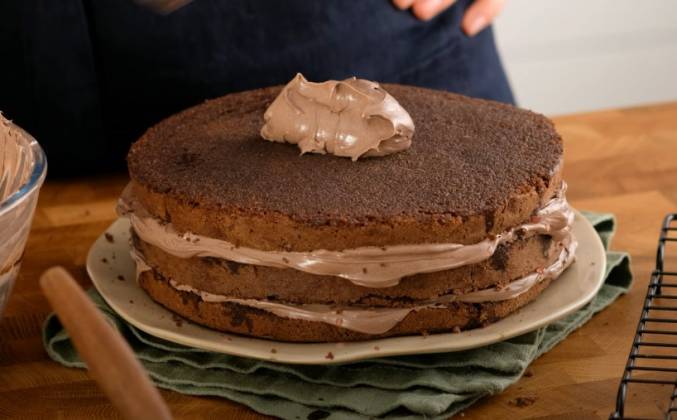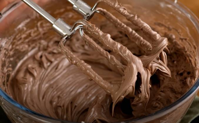 3. Налейте в кастрюльку сливки (100 гр), насыпьте сахар (190 гр), поставьте на небольшой огонь и нагревайте до растворения сахара, постоянно помешивая. Перелейте смесь в миску, прикройте пищевой пленкой и оставьте остывать до комнатной температуры. Взбейте сливочное масло (300 гр) до побеления. Продолжая взбивать вливайте небольшой струйкой сироп. Затем добавьте какао (35 гр), аккуратно перемешайте лопаткой, а затем взбейте миксером.