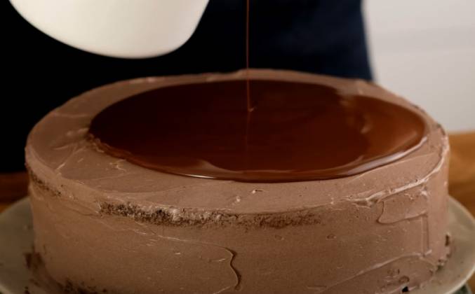 4. СИРОП-ПРОПИТКА: Растворите в горячей воде (80 гр) сахар (70 гр). Затем добавьте вишневую настойку (20 гр) и перемешайте. Соберите торт. Пропитайте первую часть бисквита сиропом, выложите 1/4 часть крема и распределите по всей поверхности. Так же повторите и с другими частями. Уберите торт в холодильник на 30 минут. 1/4 часть крема оставьте для украшения. Шоколадная глазурь: подогрейте в микроволновой печи шоколад (160 гр) и тщательно перемешайте.