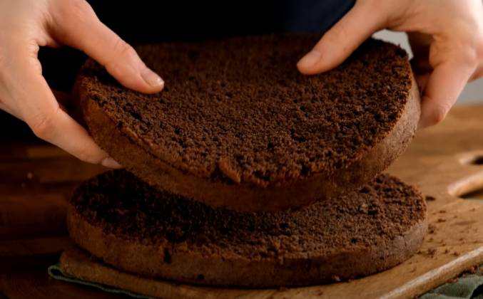 2. Выпекайте при 180 С около 30-35 минут. Готовый бисквит должен отойти по краям от формы. Так же можете проверить готовность бисквита с помощью деревянной шпажки, на ней не должно оставаться тесто. Так же бисквит должен пружинить при нажатии пальцем. Достаньте бисквит из формы и дайте остыть. Заверните остывший бисквит в пищевую пленку и оставьте его минимум на 4 часа для стабилизации и придания плотности. Бисквит можно хранить в холодильнике и несколько дней. Разрежьте бисквит на 3 части. Смотрите один из способов как разрезать бисквит. КРЕМ: