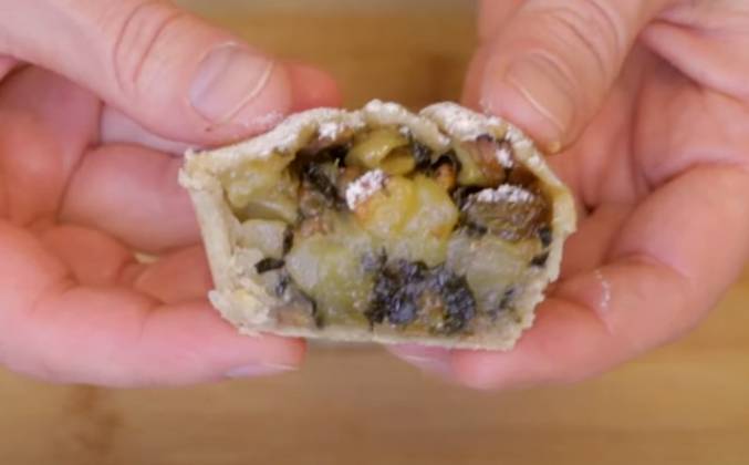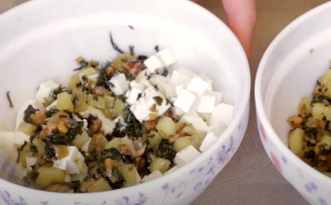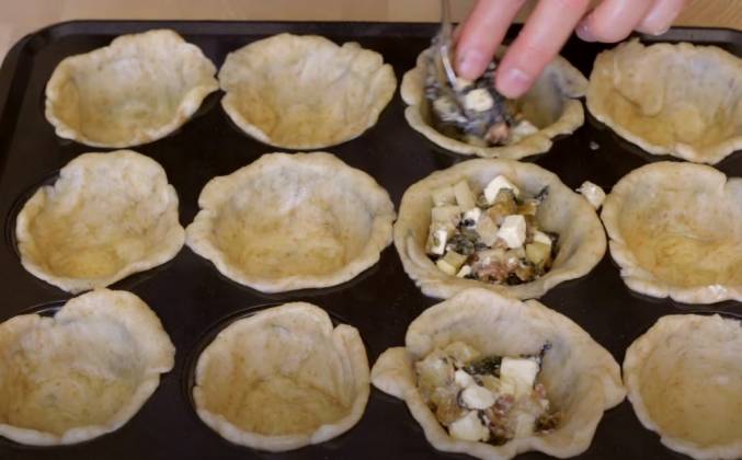 3. В меньшую часть добавить фету. Одна начинка получается в постном варианте, а вторая нет. Достать тесто и приготовить форму. Разогреть духовку до 180°С градусов. Раскатывают тесто в жгут и разделить его на 12 частей. Тесто можно раскатывать или разминать, что вам больше нравится. Уложить корзиночки в форму. Заполнить корзиночки начинкой. Края теста завернуть на начинку. Отправить форму в духовку, время выпечки примерно 20 минут. Корзинки готовы. Дать им немного остыть и можно доставать. Я желаю вам приятного аппетита и дай вам Бог здоровья!Видео рецепт ютуб ниже 👇