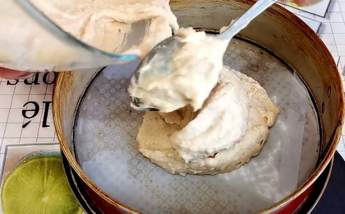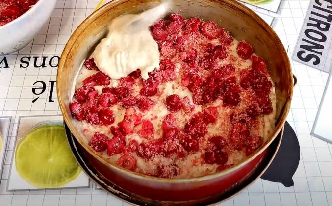 2. Ванилин на кончике ножа. Все хорошо перемешиваем. Добавляем немного цедры лимона. 120 грамм панировочных сухарей. Замешиваем тесто. Оно должно получиться консистенции густой сметаны. Выкладываем половину теста в форму, смазанную маслом и простеленную пергаментной бумагой. У меня – диаметром 22 см. Разравниваем. Сверху – распределяем половину вишен. Затем покрываем оставшимся тестом. Распределяем оставшиеся вишни.