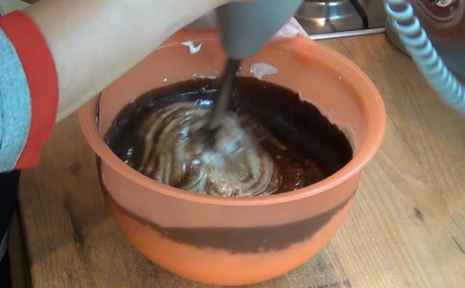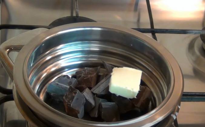 2. Получилась вот такая масса. Оставляем её сторону и приступаем к шоколаду. Ставим миску на водяную баню. В кастрюле вода. Я уже поставила разогреваться. Перекладываем сюда шоколад. Кусочек сливочного масла. Ждём, когда шоколад начнёт плавиться. Шоколад полностью растаял. Добавляем молоко. Всё вместе перемешиваем, чтобы получилась однородная масса. У нас получилась жидкая помадка. Отключаем нагрев.