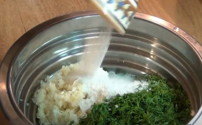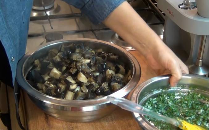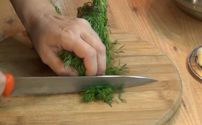 2.  Приготовим заправку для баклажанов: мелко режем укроп. Измельчаем чеснок. Я буду использовать блендер. Чеснок можно порубить ножом или выдавить через пресс. Насыпаю чеснок в мельницу. Я просто ускорю процесс. Доба Зимой в закромах каждой хозяйки всегда найдётся баночка консервированных баклажанов. Я баклажаны очень люблю. Сегодня предлагаю сделать заготовку из баклажанов на зиму. Эта закуска называется "Баклажаны как грибы". Для рецепта возьмём: 5 кг баклажанов, 350 г зелени укропа, 300 г чеснока, 300 мл растительного масла, 250 мл уксуса 9%, 4 ст.ложки соли. Нам ещё понадобятся баночки для консервирования. У вымытых баклажанов отрезаем плодоножку. Нарезаем их кубиками. Шкурку срезать не надо. Разрезаем пополам, делим на три части и режем небольшими кубиками. 3.  Порезанные баклажаны перекладываем в кастрюлю. Теперь будем бланшировать баклажаны. Мы их не варим полностью, а только бланшируем. Я добавляю в кастрюлю половину стакана воды для парообразования. Накрываем крышкой. Ставим на минимальный нагрев. Ждём, когда стрелка термоконтроллера дойдет до середины зеленого поля. Если бланшировать баклажаны в обычной кастрюле, то делаем это в воде. Сначала доводим воду до кипения. Затем погружаем порезанные баклажаны на 2-3 минуты. Потом их достаём и даём стечь воде. Приготовим заправку для баклажанов: мелко режем укроп. Измельчаем чеснок. Я буду использовать блендер. Чеснок можно порубить ножом или выдавить через пресс. Насыпаю чеснок в мельницу.