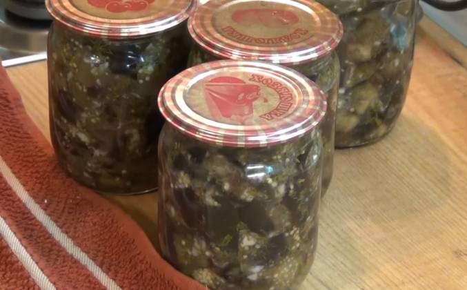 5.  Прошло 10 минут. Баночку можно снимать, но она горячая. Можно обжечься. Берём полотенце. Аккуратно переворачиваем банку и ставим её на полотенце. Теперь достаём крышку. Снимаем верхнее кольцо. Вилкой достаём крышку. Кладём сверху на банку. Таким способом можно стерилизовать не только полулитровые банки, но и литровые, двухлитровые, трёхлитровые. А также такие нестандартные. С узким горлышком она хорошо помещается сюда. Стерилизуем дальше. Закладываем баклажаны в стерилизованные банки. Сверху баночки накрываем стерилизованными крышками. Если мы хотим сразу попробовать баклажаны, то ставим их на ночь в холодильник. Утром уже можно будет есть приготовленную закуску. Я делаю заготовку на зиму. Будем банки стерилизовать. Берём большую широкую кастрюлю. Застилаем дно салфеткой. 6.  Сверху устанавливаем баночки. Наливаем воду. Вода должна быть по уровню "плечиков" у банок. Доливаем. Достаточно. Включаем нагрев. Можно сначала поставить большой. После того, как вода закипит, уменьшить до среднего. Доводим до кипения и стерилизуем полулитровые баночки 10-15 минут. Литровые баночки стерилизуем 20-30 минут. Вода закипела. Можно убавить огонь. Стерилизуем 10 минут. Можно выключать нагрев. Достаём баночки из кастрюли. Закатываем крышки на банках. Подготовленные баночки переворачиваем вверх дном. Укутываем и оставляем так до полного остывания. Потом баночку достаём и храним в кладовке при комнатной температуре.
