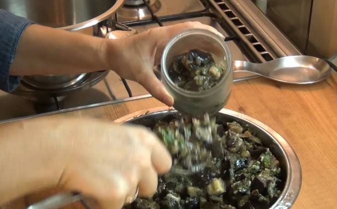 4.  Я просто ускорю процесс. Добавл вляем соль. Растительное масло. Уксус. Всё перемешиваем. Всё. Баклажаны готовы. Открываем крышку. Отключаем нагрев. Перекладываем баклажаны в миску. Переливаем заправку к баклажанам. Всё хорошо перемешиваем. Сейчас я буду стерилизовать банки. Мне понадобятся полулитровые баночки с крышками, которые закручиваются при помощи ключа. Также я использую 800-граммовые банки с закручивающейся крышкой. Миска с водой. Вилка. Специальная крышка с отверстием. Эту крышку я купила в хозяйственном магазине. Она хорошо устанавливается на миску или кастрюлю. Включаем средний нагрев, чтобы пошёл пар. Забыла! В горячую воду погружаем крышки. Будем стерилизовать банки и крышки одновременно. Крышка с отверстием. Сверху устанавливаем банку. Баночка стерилизуется около 10 минут. 5.  Прошло 10 минут. Баночку можно снимать, но она горячая. Можно обжечься. Берём полотенце. Аккуратно переворачиваем банку и ставим её на полотенце. Теперь достаём крышку. Снимаем верхнее кольцо. Вилкой достаём крышку. Кладём сверху на банку. Таким способом можно стерилизовать не только полулитровые банки, но и литровые, двухлитровые, трёхлитровые. А также такие нестандартные. С узким горлышком она хорошо помещается сюда. Стерилизуем дальше. Закладываем баклажаны в стерилизованные банки. Сверху баночки накрываем стерилизованными крышками. Если мы хотим сразу попробовать баклажаны, то ставим их на ночь в холодильник. Утром уже можно будет есть приготовленную закуску. Я делаю заготовку на зиму. Будем банки стерилизовать. Берём большую широкую кастрюлю. Застилаем дно салфеткой.
