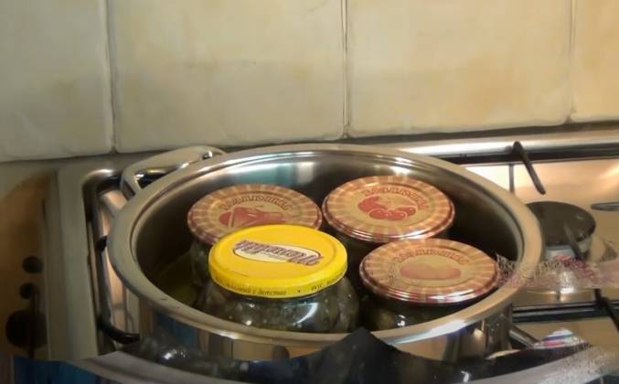 6.  Сверху устанавливаем баночки. Наливаем воду. Вода должна быть по уровню "плечиков" у банок. Доливаем. Достаточно. Включаем нагрев. Можно сначала поставить большой. После того, как вода закипит, уменьшить до среднего. Доводим до кипения и стерилизуем полулитровые баночки 10-15 минут. Литровые баночки стерилизуем 20-30 минут. Вода закипела. Можно убавить огонь. Стерилизуем 10 минут. Можно выключать нагрев. Достаём баночки из кастрюли. Закатываем крышки на банках. Подготовленные баночки переворачиваем вверх дном. Укутываем и оставляем так до полного остывания. Потом баночку достаём и храним в кладовке при комнатной температуре.Видео рецепт ютуб ниже 👇