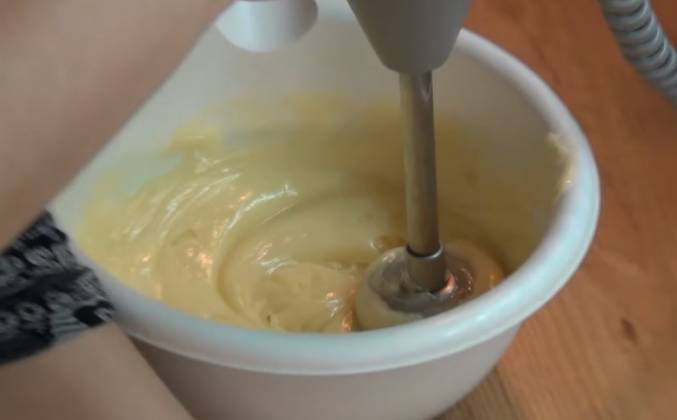 2. Теперь будем подмешивать в тесто яйца по одному. Разбили яйцо и размешиваем его. Тесто готово. В общей сложности сюда ушло 5 яиц. Теперь подготовим противень. Я его уже смазала тонким слоем растительного масла. Беру кондитерский мешочек и буду его заполнять тестом. Теперь отсаживаем тесто на противень в виде полосочек. Оставляем большое расстояние между ними. Они будут увеличиваться в 2-3 раза. Ставим выпекаться эклеры в разогретую до 200 С духовку. Будем готовить крем. Смешаем 1 яйцо с молоком до однородности. При помощи блендера. Всё хорошо перемешалось. Отключаем блендер и убираем его в сторону. Ставим кастрюлю средний на огонь. Добавляем сахар. Теперь варим.