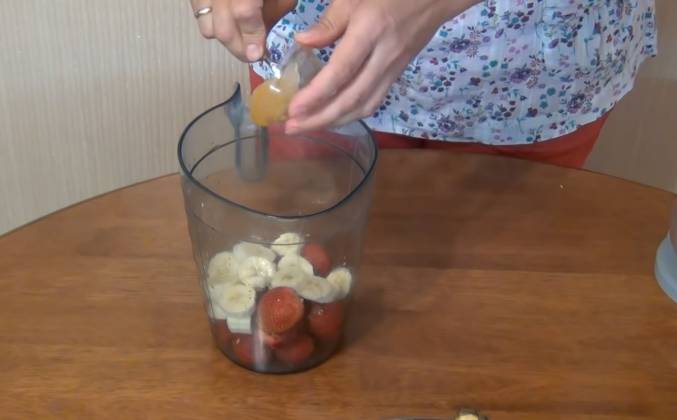 2. Нам косточки в коктейле не нужны. Иначе потом их будет тяжело достать. Выдавливаем сок. Добавляем мёд. Примерно 1-2 столовые ложки. Последний ингредиент - ряженка. Можно использовать кефир или йогурт. Берём блендер. Я надела многофункциональную насадку. Всё тщательно перемешиваем, взбиваем. Коктейль готов! Убираем блендер. Будем разливать по стаканчикам. Наливаем не до конца, потому что мы будем ещё украшать.