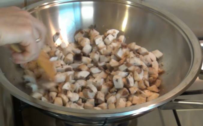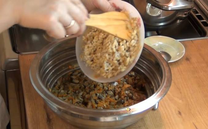 3. Грибы с овощами практически готовы. Лук стал прозрачным, морковь уже готова. Надо добавить немного соли. И перца. Перемешиваем. Готовим ещё минуты две. Грибы готовы. Можно их отключать. Перекладываем их в отдельную миску остывать. Теперь соединяем 2 части начинки: пшеницу и грибы с овощами. Перекладываем пшеницу к грибам. Перемешиваем. Начинаем формировать голубцы. Берём лист капусты. Срезаем толстую часть.