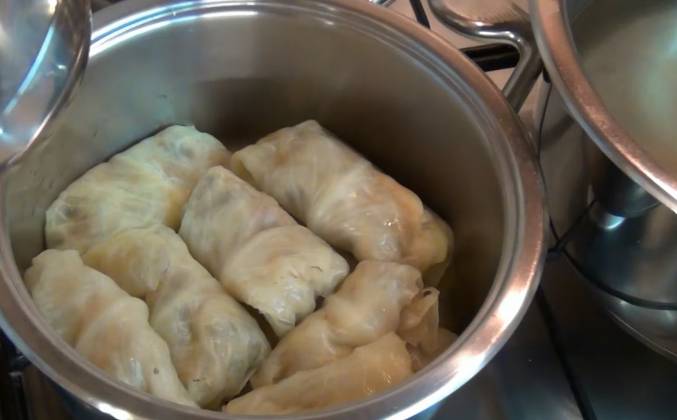 4. Выкладываем начинку. Сворачиваем. Подготовленный голубец укладываем в кастрюлю. Теперь к голубцам добавляем овощной бульон. Можно также добавить томатную пасту, немного чеснока. Включаем огонь. Небольшой. Накрываем крышкой. Варим до середины зелёного поля. Стрелка термоконтроллера дошла до середины зелёного поля. Отключаем нагрев. Оставляем под закрытой крышкой ещё на 10 минут. Если варить голубцы в обычной посуде, то доводим их до кипения и провариваем в течение 5 минут. Постные голубцы довольно питательны и вкусны.Видео рецепт ютуб ниже 👇