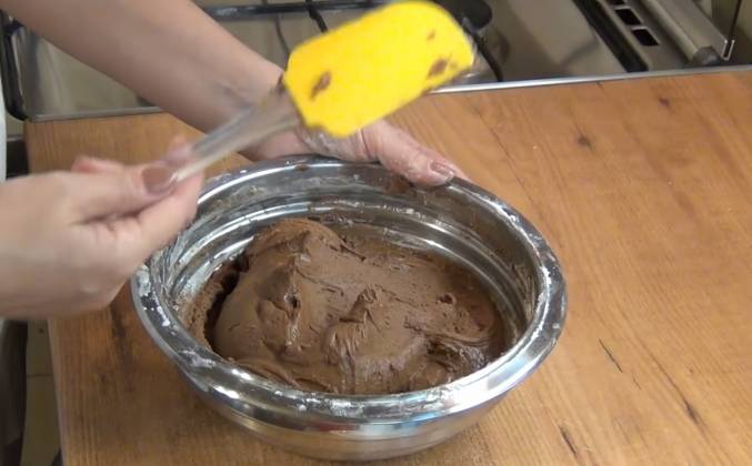 2.  После того, как смешали первое яйцо, смешиваем следующее. Полученную массу переливаем в ёмкость, в которой будет удобно замешивать тесто. Добавляем муку, соль и разрыхлитель, просеянные через сито. Замешиваем тесто. Сразу добавляю разрыхлитель. 1/3 ч.ложки соли. Просеиваем и замешиваем тесто. У нас получилось эластичное, липкое тесто. Такое тесто тяжело замесить руками, поэтому я использую лопатку. Тесто накрываю крышкой и убираю в холодильник на 3-4 часа. Тесто охладилось и теперь его легко можно брать руками. Формируем из теста небольшие шарики. 3.  Шарики нужно обвалять в сахарной пудре, сделать плотную сахарную оболочку. Кладём на противень, покрытый пергаментной бумагой. Ставим печенье выпекаться в разогретую до 180 С духовку. Прошло 17 минут. Можно проверить печенье. Проверять я буду при помощи деревянной палочки. Протыкаем печенье. Если палочка остаётся сухой (как у меня), значит печенье готово. Можно его доставать из духовки. Оставляем немного остыть. Мраморное печенье полностью отражает своё название. После запекания в духовке его поверхность растрескивается. Оно становится похожим на мрамор.