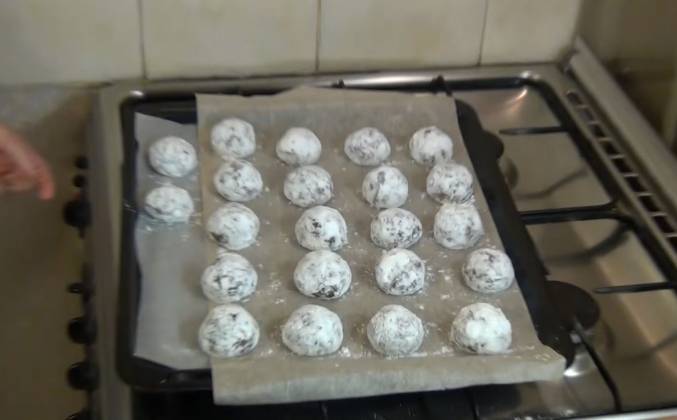 3.  Шарики нужно обвалять в сахарной пудре, сделать плотную сахарную оболочку. Кладём на противень, покрытый пергаментной бумагой. Ставим печенье выпекаться в разогретую до 180 С духовку. Прошло 17 минут. Можно проверить печенье. Проверять я буду при помощи деревянной палочки. Протыкаем печенье. Если палочка остаётся сухой (как у меня), значит печенье готово. Можно его доставать из духовки. Оставляем немного остыть. Мраморное печенье полностью отражает своё название. После запекания в духовке его поверхность растрескивается. Оно становится похожим на мрамор.Видео рецепт ютуб ниже 👇