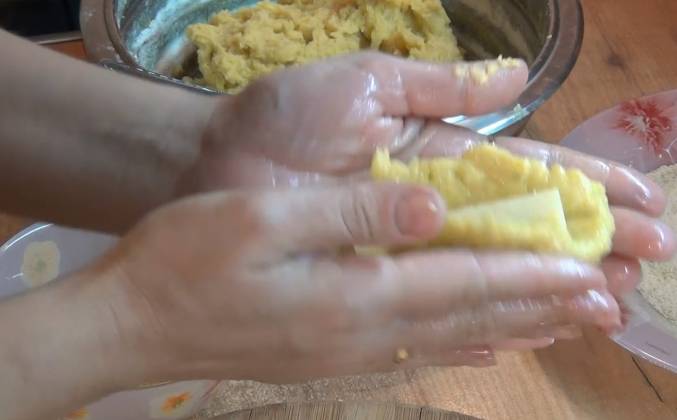 3. Смазываю руки растительным маслом. Будем формировать картофельную котлету. Руки смазываем маслом, чтобы тесто не прилипало к рукам. Делаем оладушек. Кладём на него брусочек. Залепляем. Формируем вот такие палочки. Обваливаем со всех сторон в панировочных сухарях. Выкладываем на гриллер. Обжариваем с четырёх сторон, переворачивая. Жарим на среднем огне. Как только они поджарились с одной стороны, переворачиваем на противоположную. Потом жарим с боков. Картофельные палочки с сыром могут быть отдельным блюдом. Также их можно подавать, как гарнир к рыбе и мясу. Готовьте с удовольствием и приятного вам аппетита!Видео рецепт ютуб ниже 👇