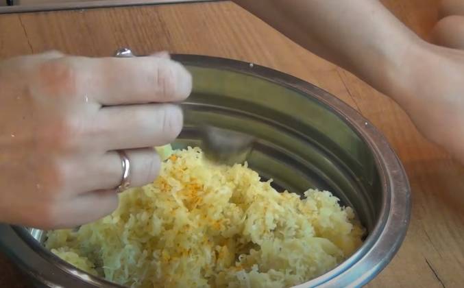 2. В перетёртый картофель добавляем специи по вкусу. Куркума. Немного кориандра добавим. Чуть-чуть чёрного перца. Всё это по вкусу. Обязательно соль. Потом ещё попробую и добавлю, если понадобится. Два яйца. Перемешиваем. Куркума придала картофелю приятный солнечный цвет. Жёлтый. Добавляем 3 столовые ложки муки. Делаем картофельное тесто. Снова хорошо перемешиваем. Вот такое получилось картофельное тесто. Оно липкое и вязкое. Гриллер ставим разогреваться. Наливаю рафинированное оливковое масло. Немного. Пускай разогревается. В отдельную миску также налью немного масла. Сыр нужно нарезать на брусочки. Разрезаю вдоль. Нарезаю небольшими брусочками.