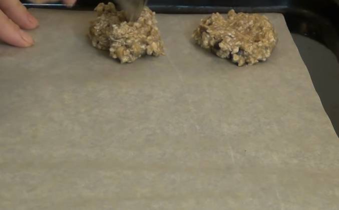 2. Потом уже буду добавлять овсяные хлопья. Орехи и чернослив надо измельчить. Чернослив я порежу на маленькие кусочки. Орехи можно просто порубить. Можно орехи и чернослив положить сверху на печенье, когда будем его формировать перед выпеканием. Получилась такая густая масса. Пока я перемешивала, овсянка немного набухла. Получилась нужная консистенция. Чтобы печенье получилось более сладким, можно сюда добавить мёд. Берём овсянку столовой ложкой и выкладываем на пергаментную бумагу. Такие небольшие печенюшки.