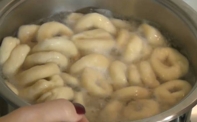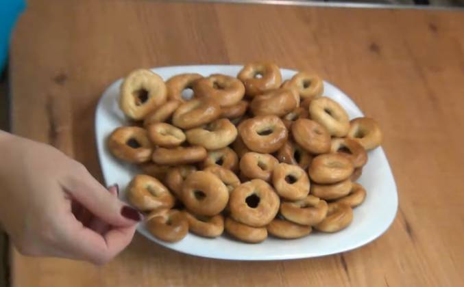 3. В кипящую воду добавляем 1 столовую ложку сахара. Погружаем в воду сушки. Делаем это быстро, варим их, пока они не всплывут кверху, как пельмени. Как только сушки всплыли - нужно отключить нагрев. При помощи шумовки их достаём, чтобы стекла вода. Выкладываем на противень, устеленный пергаментной бумагой. Бумагу можно смазать растительным маслом. Ставим сушки сушиться в разогретую до 230 С духовку. Прошло 20 минут. Сушки готовы. Достаём их из духовки. Оставляем сушки до полного остывания. Сушка полностью остыла. Будем снимать пробу. Сушка немного мягкая. Думаю, ей нужно постоять ещё ночь, чтобы подсохнуть. Вкус ванильный, как в магазине. Вкусно. Единственное "но". Когда готовила, сушки прилипали к пергаментной бумаге. Готовить нужно на противне, смазанном маслом. Готовьте с удовольствием и приятного вам чаепития!Видео рецепт ютуб ниже 👇