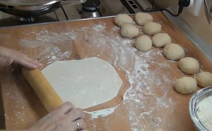 2. Тесто постояло 1 час. Перекладываем тесто на стол. Немного обминаем и формируем небольшие шарики. Выкладываем их на стол и оставляем на 10 минут. Тесто постояло 10 минут. Шарики немного увеличились в объёме. Выпекать лаваш будем в самой большой сковороде, какая у меня есть. У меня это гриллер диаметром 28 см. Можно выпекать на противне в духовке или на поверхности газовой плиты. Будем раскатывать тесто. Берём один шарик и очень тонко раскатываем на поверхности, посыпанной мукой. Нужно его немного растянуть. Раскатываем дальше. Тесто становится почти такого размера, как мне нужно. Можно немножко потянуть. Тесто практически не рвётся. Оно хорошо тянется.
