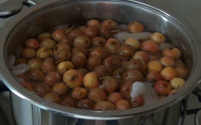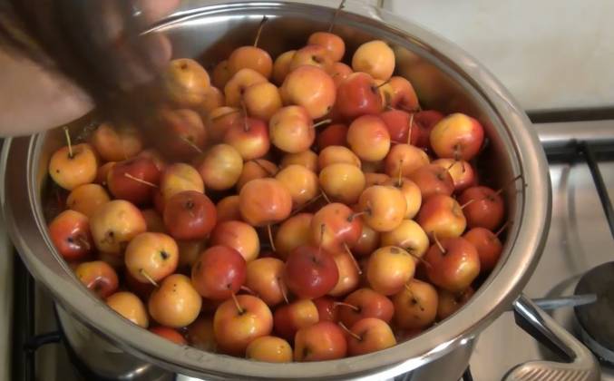 2. Протыкаем через хвостик ранетку насквозь. Сахар весь растворился. Сироп прозрачный. Отключаем нагрев. Оставляем сироп на 15 минут. Сама буду дальше протыкать ранетки. Подготовленные ранетки пересыпаем в сироп. Обязательно с хвостиками. Перемешиваем, чтобы яблоки были все в сиропе. Ставим на средний нагрев. Доводим яблоки до кипения и провариваем в течение 5 минут. Яблоки проварились. Накрываем яблоки тарелкой, чтобы они все были покрыты сиропом. Оставляем так на сутки. Варенье постояло. Сверху оно даже засахарилось. Если кастрюлю наклонить, то видно сироп. Тарелку я сейчас достать никак не смогу, поэтому ставлю кастрюлю вместе с тарелкой на огонь.