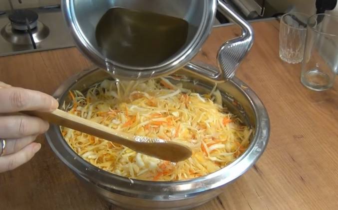 3. Добавляем уксус. Подготовленным маринадом заливаем капусту. Немного перемешаем, чтобы вся капуста пропиталась маринадом. Накрываем капусту крышкой и прижимаем, чтобы она дала сок. Ставим под гнёт на сутки. Капуста по-корейски с куркумой готова. Хранить такой салат следует в холодильнике и подавать в охлаждённом виде.Видео рецепт ютуб ниже 👇