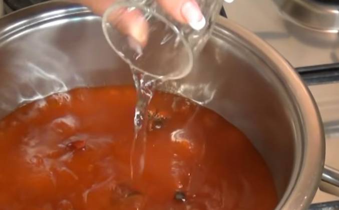 2. Вот так протираем. Шкурка от перца остаётся в сито. Готовое пюре переливаем в чистую посуду. Оно получилось однородным, без лишних примесей. Готово. Теперь добавляем специи. Можно использовать бадьян, кардамон, перец душистый горошком, гвоздику... Я использую бадьян, кардамон и душистый перец. Включаю самый маленький нагрев и добавляю в варенье специи. Обязательно добавляем острый перец. Нам нужна половинка стручка. Семена удаляем. Делим на две половинки и добавляем в варенье. Кипятим в течение 15 минут на меленьком огне. Как только варенье начинает кипеть - добавляем сюда яблочный или винный уксус. Перемешиваем и варим в течение 15 минут.