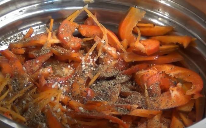 3. У меня остался перец и морковь. Начнём с моркови. Берём морковь и специальную тёрку для корейской моркови. Натираем морковь на тонкие длинные полоски. Получаются вот такие полоски. Пока я натирала морковь, баклажаны поджарились. По времени прошло около 10 минут. Отключаю нагрев. Отставляю в сторону. Теперь сладкий перец. Будем его нарезать соломкой. Пока баклажаны остывают, добавляем в овощи все наши специи и зелень. Добавляем кунжут. Кориандр. Мёд. Лимонный сок или уксус. Перец молотый - около 1 ч.ложки. Зелень с чесноком. Они немного постояли и пустили сок. Перемешиваем. Можно добавлять сюда баклажаны. Перекладываем и всё вместе хорошо перемешиваем. Добавляем соевый соус и ещё раз перемешиваем. Уже красиво получается. Накрываем крышкой и оставляем в холодильнике на сутки, чтобы салат настоялся. Любители остренького по достоинству оценят баклажаны по корейски.Видео рецепт ютуб ниже 👇