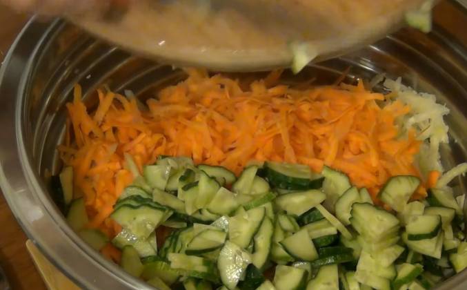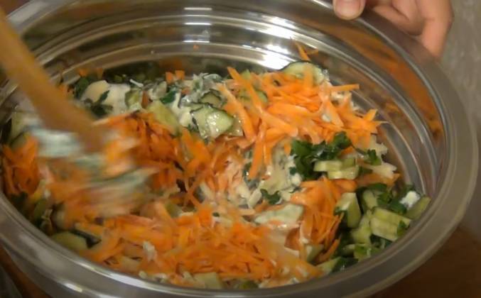 2. Очищаем морковь и будем её натирать на крупной тёрке. Морковка готова. Теперь нарежем огурцы. Они с собственного огорода. Хочу попробовать: не горькие ли они? В самый раз! Огурцы нарезаем на четвертинки и тоненько режем. Перекладываем огурцы к остальным овощам. Разрезаем лук пополам и нарезаем на мелкие кусочки. Я не люблю, когда в салате крупный лук. Я всегда его нарезаю тонко и мелко. Осталась зелень. Мелко нарезаем её. В этот салат можно также добавить листья салата.