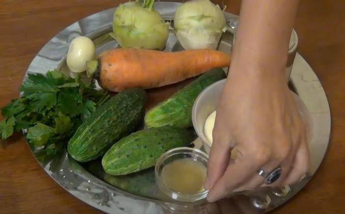 Салат из кольраби. В этом году мы посадили несколько сортов капусты. Два сорта белокочанной: ранний сорт и поздний. Поздняя капуста фиолетовая, а ранняя зелёная. Она уже созрела. Мы её соберём и нажарим пирожков. Поздний сорт ещё не готов. Он будет готов к осени. Здесь у нас растёт кольраби и цветная капуста. Цветная капуста тоже ещё не созрела. Она будет в конце лета - начале осени. Кольраби уже созрела. Я первый раз посадила такую капусту у себя на огороде. Раньше её видела на картинке или по телевизору. В этом году мы решили её посадить. Оказывается в наших краях она может дать 2 урожая за сезон. В начале июлю она уже готова. Она похожа чем-то на репку. Листиков очень мало, а кочан достаточно крупный. Она выросла разных размеров. Я прочитала в интернете, что кольраби у нас уже созрела. Что из неё приготовить - я поищу в интернете. Срываем! Первый раз вместе с вами срываю капусту кольраби. Вот она какая красавица! В еду пойдёт только кочерыжка. Мы уже у меня на кухне. Как я и обещала - нашла рецепт блюда из кольраби. Я решила приготовить салат из свежих овощей, которые растут у меня на грядке. Нам понадобятся: 2 кольраби, 1 морковь, 2 огурца, зелень петрушки или укропа, 1/2 репчатого лука, майонез, 1 ст.ложка лимонного сока, соль и перец по вкусу. Помните: на грядке я сорвала крупную кольраби? В два раза больше, чем вот эта. Такая кольраби не годится, т.к. она перезрела и стала жёсткая и волокнистая. Её тяжело нарезать и в пищу она не годится. Отдам её на корм птицам соседке.