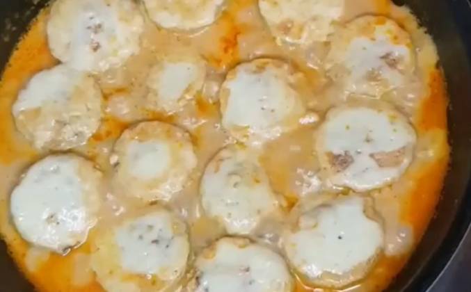 2. Для соуса смешать сметану, томатную пасту, чеснок и 200мл воды. Колечки из кабачков начинить фаршем.Видео рецепт ниже 👇