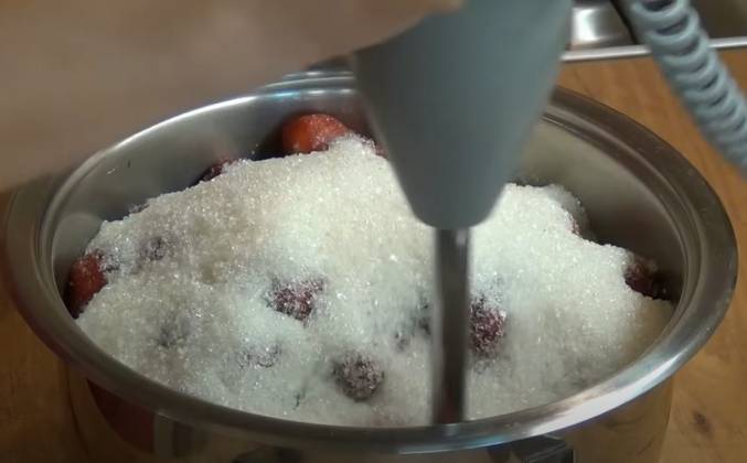 2. Берём блендер с многофункциональной насадкой, чтобы всё перемолоть и сделать пюре. На первой скорости перемалываем. Пюре готово. Добавляем пектин. Перемешиваем снова блендером. Всё готово. Отключаем блендер - он нам больше не нужен. Конфитюр варится очень быстро, как варенье "пятиминутка". Доводим до кипения и варим в течение 4-5 минут. Ставлю кастрюлю на средний огонь. У меня маленькая конфорка, поэтому я ставлю на средний огонь. Доводим до кипения. Периодически помешиваем, чтобы снизу не подгорело. Конфитюр закипел.
