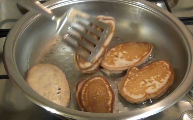 3. Клубничкой! Я уже нагрела гриллер до "бегущих шариков воды". Добавляем немного растительного масла. Беру большую ложку. Теперь можно жарить оладьи. Последний. Они получаются вытянутыми. Жарим на среднем огне. Поджариваем сначала с одной стороны, потом перевернём на другую. Переворачиваем оладьи на другую сторону. Последний. Поджариваем со второй стороны. Вот мои клубничные оладьи!Видео рецепт ютуб ниже 👇