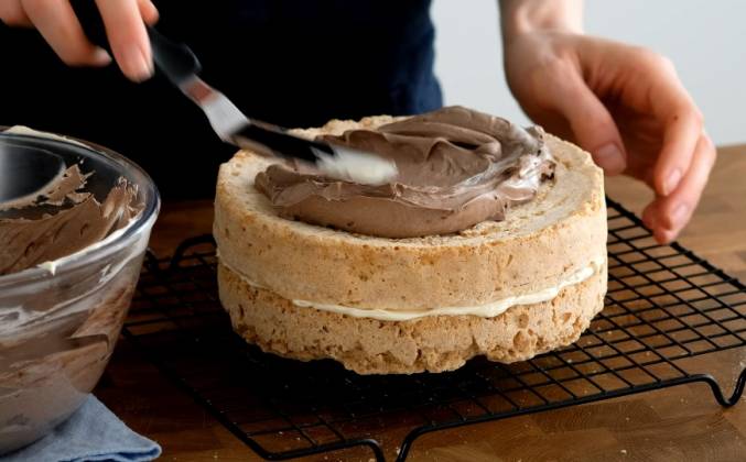4. Соберите торт. Выложите часть крема на первый корж, разровняйте и накройте вторым коржом. В оставшийся крем добавьте какао (10 гр) и тщательно перемешайте. Выложите шоколадный крем на торт и распределите сверху и небольшим слоем по бокам. Оставьте немного шоколадного крема для декора.