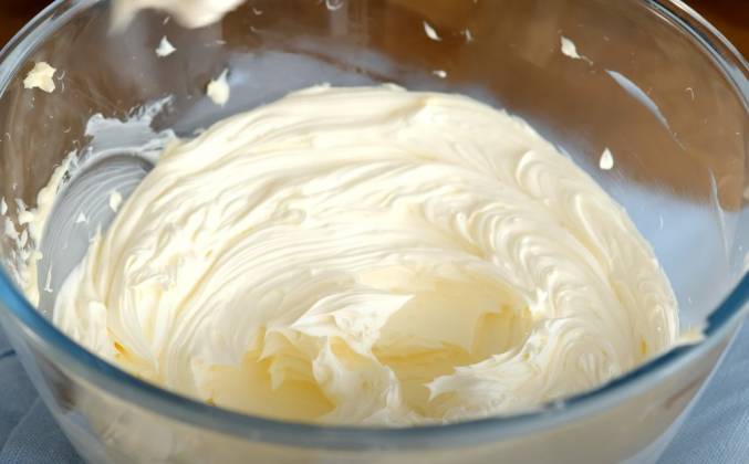 3. Процедите сироп через сито, закройте пищевой пленкой и поставьте остывать до комнатной температуры. Взбейте сливочное масло (250 гр) до побеления. Для удобства перелейте сироп в кувшинчик. И добавляя небольшими порциями продолжайте взбивать масло. Отложите небольшую часть светлого крема в кондитерский мешок для декора.