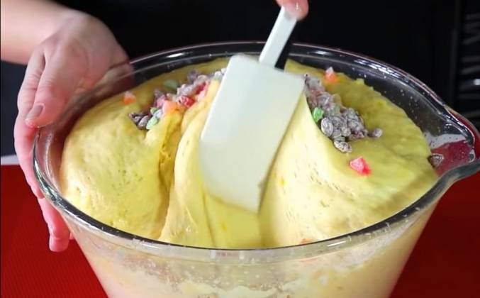 2. К изюму и добавляю цукаты и присыпаем мукой, перемешиваем. Если изюм у вас жесткий, то его предварительно можно на пять минут замочить в кипятке. У меня изюм мягкий, я просто его промыла. Какой у меня аромат от теста стоит на кухне! Теперь сюда добавлю изюм и сухофрукты и все хорошо перемешаю. Еще раз накрою пищевой плёнкой и оставлю подниматься на 30-35 минут.