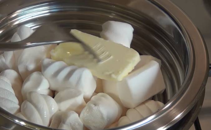 5. Помадка готова убираем её с паровой бани. Смазываем помадкой всю поверхность торта. И верх, и боковые части. Поверхность разровняли. Ставим застывать в холодное место. Сверху торт будем покрывать мастикой. Мастику приготовим из маршмэллоу. Ставим маршмэллоу на водяную баню. Добавляем кусочек сливочного масла. Лимонный сок. Ждём, когда маршмэллоу начнёт плавиться. Маршмэллоу растаял. Добавляем сахарную пудру. Именно сахарную пудру, а не сахар. Замешиваем. Получается такая мастика. Когда мастику становится тяжело замешивать вилкой замешиваем вручную. Я хочу покрасить мастику в два цвета жёлтый и коричневый. Немного мастики оставим белого цвета. В жёлтый цвет покрасим при помощи куркумы, в коричневый какао. Посыпаем стол сахарной пудрой. Добавляем какао. Перемешиваем.